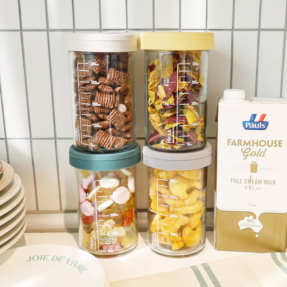헥사 슬림 원통형 눈금 밀폐 유리병 400ml 실리콘뚜껑 4종세트