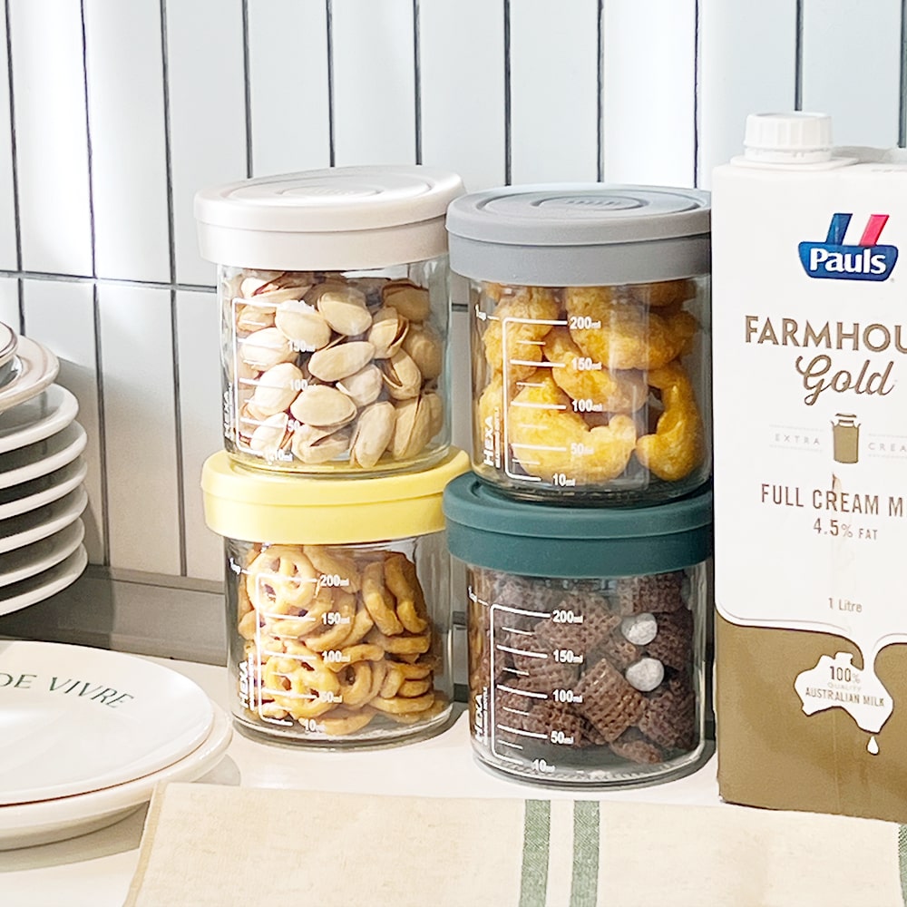 헥사 슬림 원통형 눈금 밀폐 유리병 250ml 실리콘뚜껑 4종세트