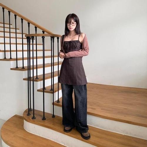 [다잇템] 여성 리본 어깨끈 쁘띠 면원단 편한 격자 원피스_23227072_588872
