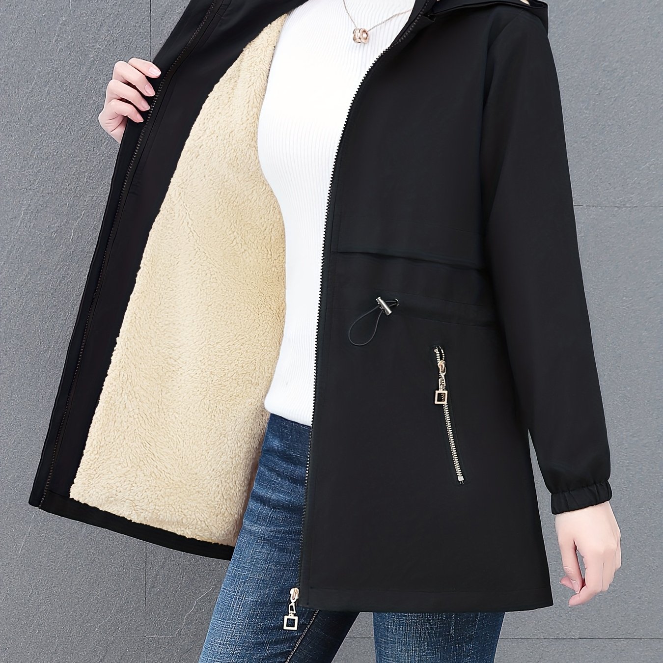 TEMU 여성용 미디 길이 후드 플리스 안감 재킷, 가벼운 럭셔리 아우터, 도시 스타일에 완벽, 높은 가성비, 다양한 색상으로 제공, 따뜻함과 다용도로 활용 가능한 후드 디자인, 캐주얼 및 출퇴근 스타일, 컷