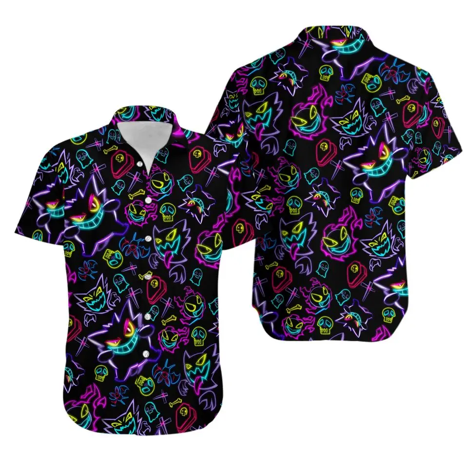 TEMU 남성용 캐주얼 반팔 셔츠, 해골 & 토끼 프린트 - 부드러운 폴리에스터 204gsm, 버튼업 칼라 & 커프스, 디자인