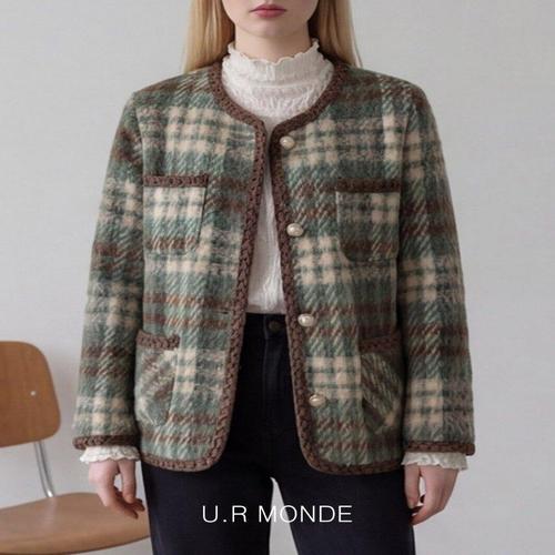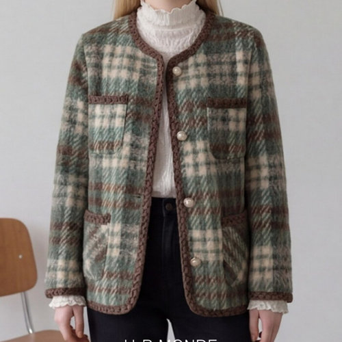 [유아몽드]봄신상 레트로 체크 배색 진주 버튼 포켓 라운드 자켓