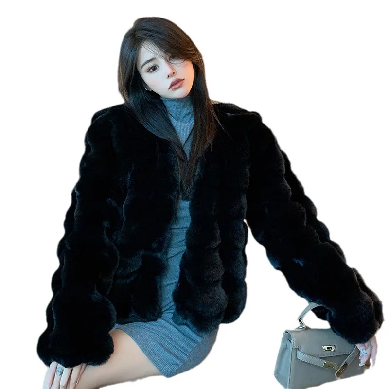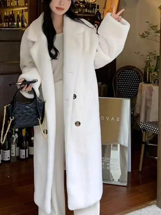 2025년 신상 여성 겨울 플러시 두꺼운 따뜻한 루즈핏 여성 인조 토끼털 코트 루즈핏 라펠 퍼 코트