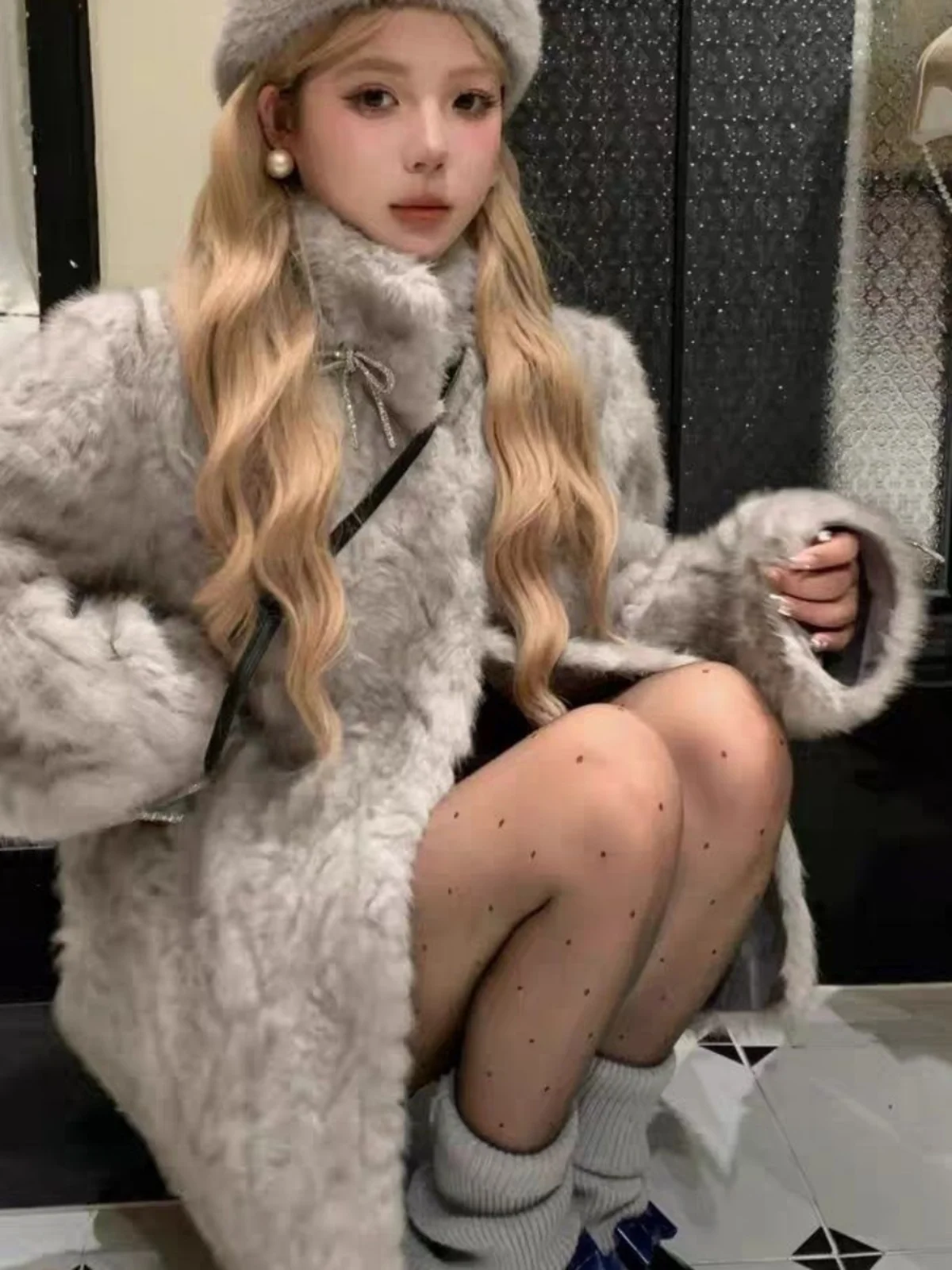 2024 겨울 새로운 토끼 모피 코트 여성 모피 원피스 스탠드 칼라 토끼 모피 패션 두꺼운 코트