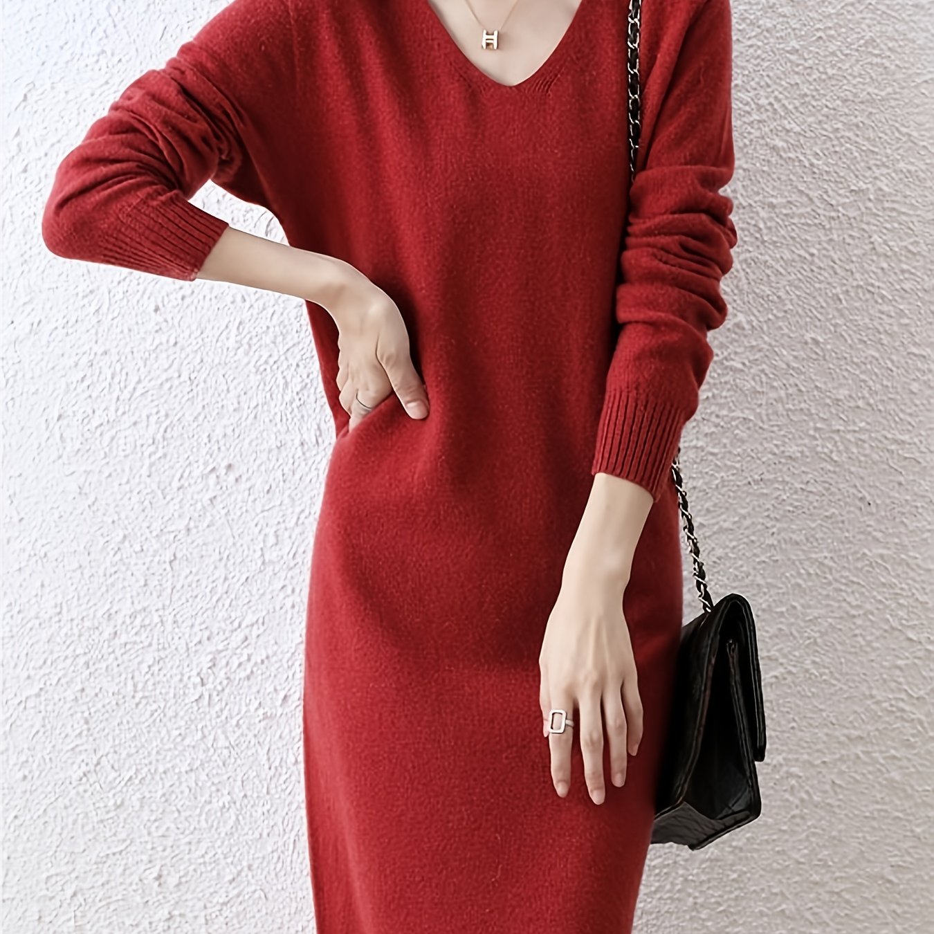 TEMU 여성용 우아한 프렌치풍 V넥 스웨터드레스 - 진홍색 O버사이즈 미디엄길이 라운드넷에서 V넥으로 변하는 칼라, 세탁기 가능 사계절/겨울철 캐주얼 & 포멀 이벤트에 적합한 코지 소재 (안감없는 디자인)