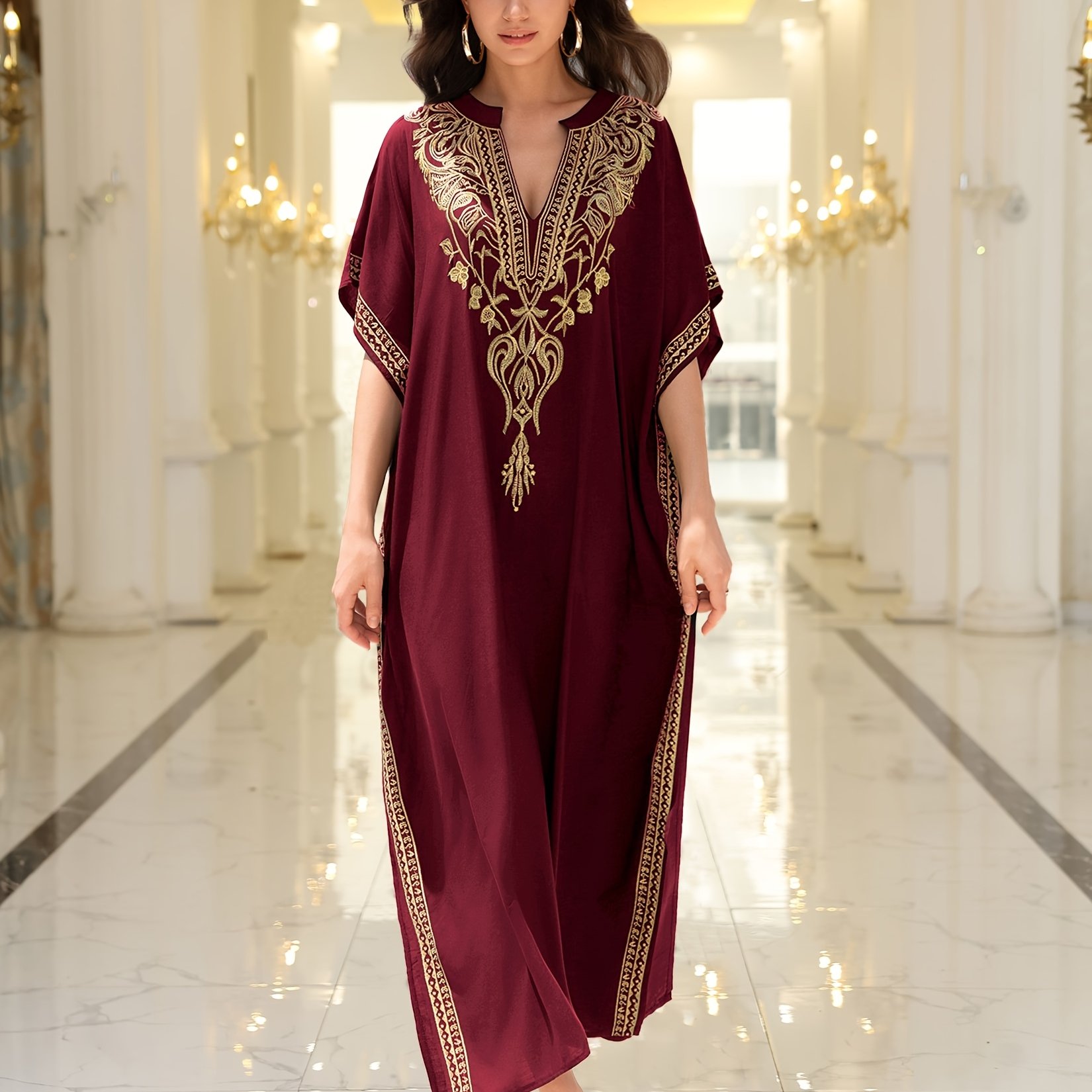 TEMU 1pc EDOLYNSA V넥 자수 카프탄 드레스 - 100% 비스코스, 부족 패턴, 짧은 박쥐 소매, 측면 슬릿, 우아한 리조트 로브 커버업, 캐주얼 해변 의류 Q1761