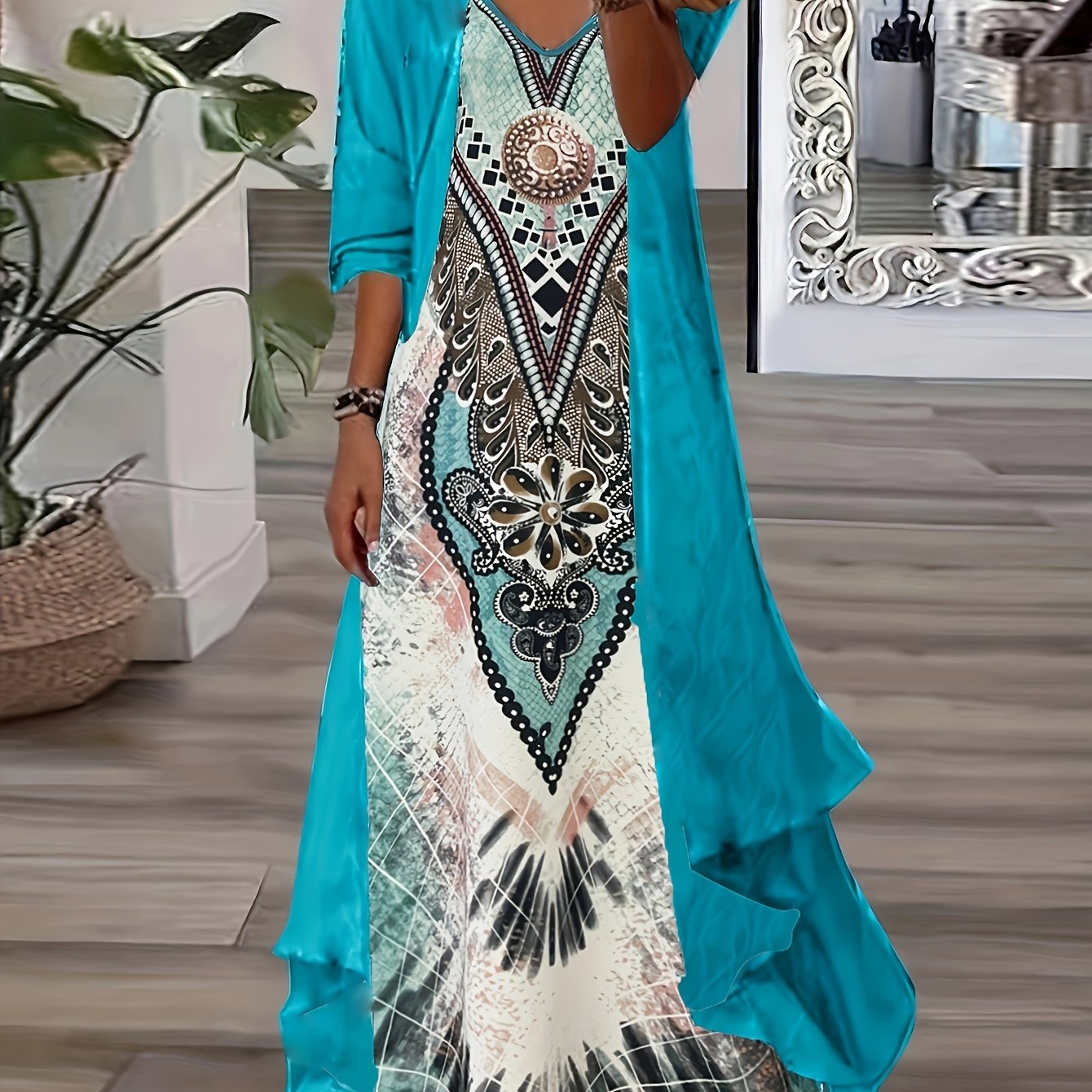 TEMU 패션 여성 민족 프린트 롱 드레스 투피스 세트, 여성 반팔 V넥 패턴 프린트 맥시 드레스
