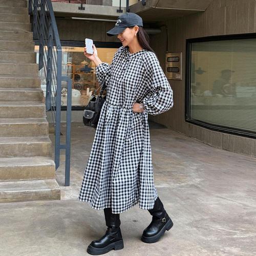 [유야]여성 면 체크 롱 원피스 임부복 -FOP0595- 봄 가을