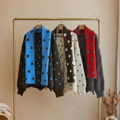 [옷자락] 여자 키치무드 도트 머플러 노카라 니트 가디건