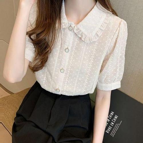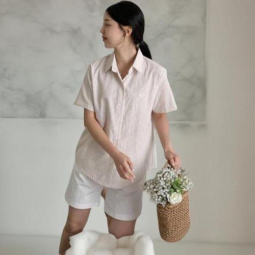 [옷자락]여성 클래식 스트라이프 자수 카라 반팔 블라우스