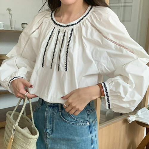 슈팅스타 / 루즈핏 라운드넥 자수 퍼프소매 간절기 블라우스