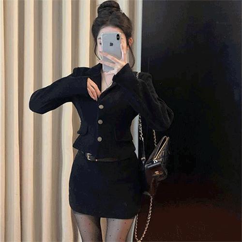 [르뚜앙]망디노 코듀로이 슬림핏 블랙 크롭 자켓 키작녀 미니 스커트 투피스 셋업 봄 가을 겨울 하객룩 ..