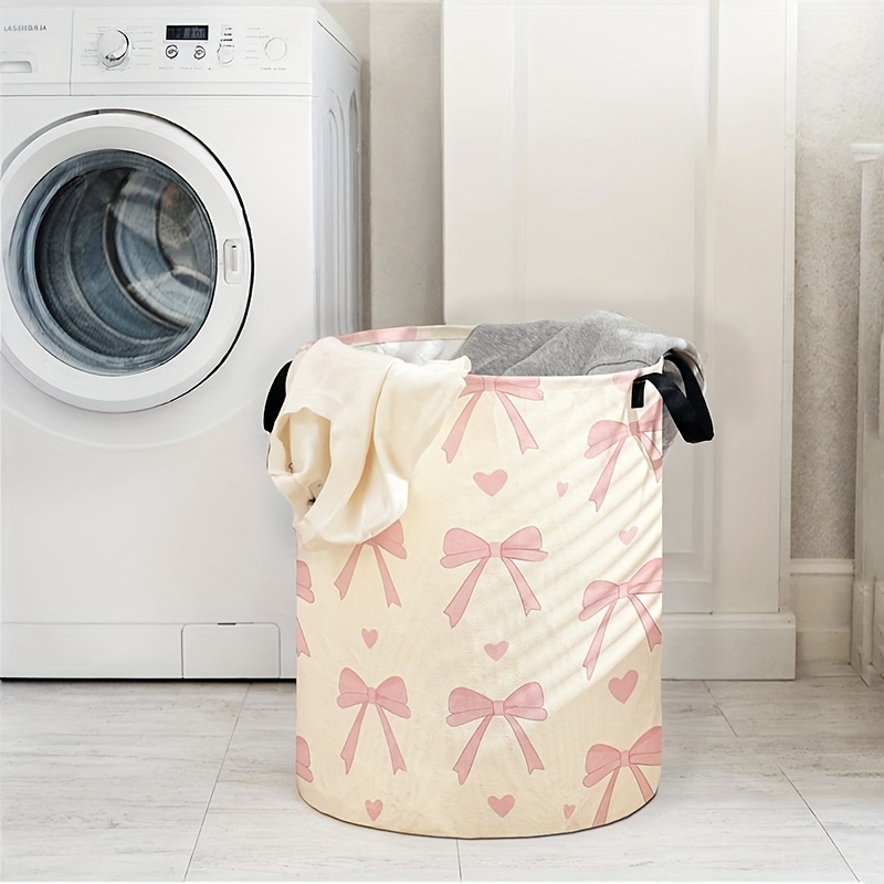 TEMU 핑크 리본과 하트 프린트 세탁 바구니 - 손잡이가 있는 둥근 보관 바구니, 옷, 책, 가정 장식에 이상적, 침실, 욕실, 거실 등 다양한 곳에서 사용할 수 있는 다용도 제품, 세탁실 액세서리|빨래바구니