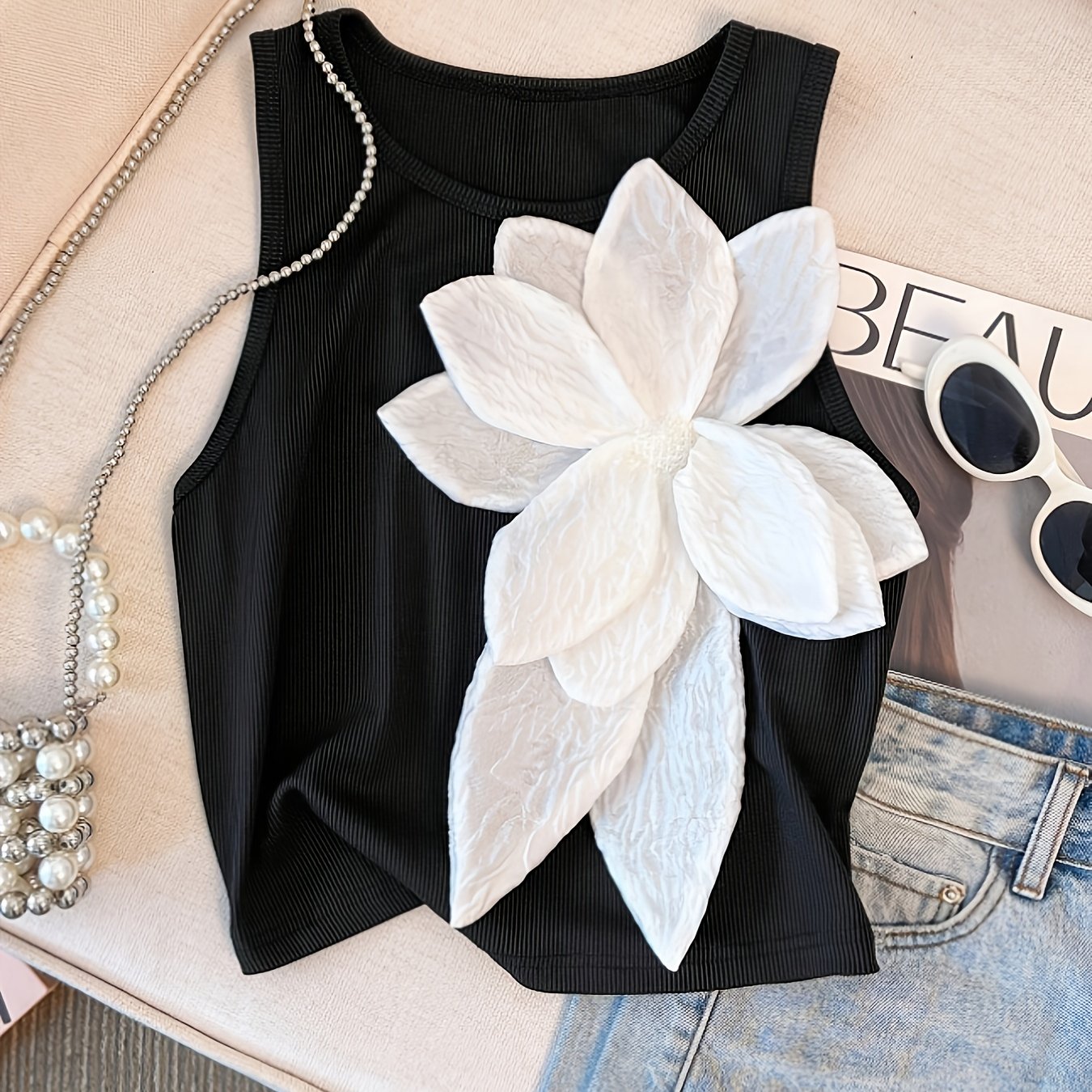 TEMU 여성용 스타일리시한 슬리브리스 탱크 탑, 대형 화이트 꽃 프린트 - 캐주얼 크루 넥, 가벼운 폴리에스터 소재, 봄 & 여름 의상에 완벽한 꽃 프린트 블라우스