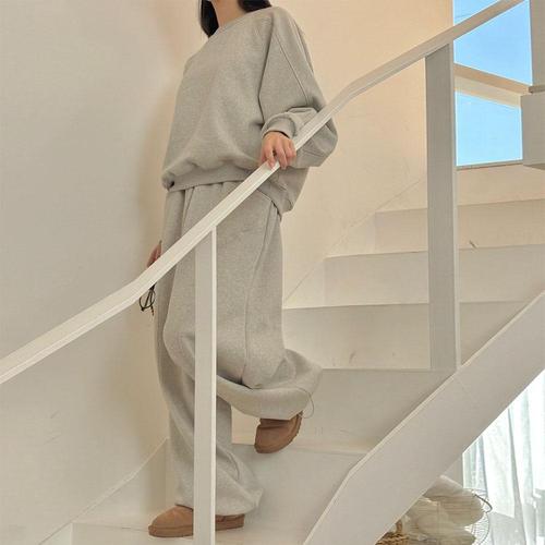 [문에이블]문에이블 여자 여성 겨울 따뜻한 데일리룩 기모 루즈핏 절개 맨투맨 밴딩 팬츠 트레이닝 세트