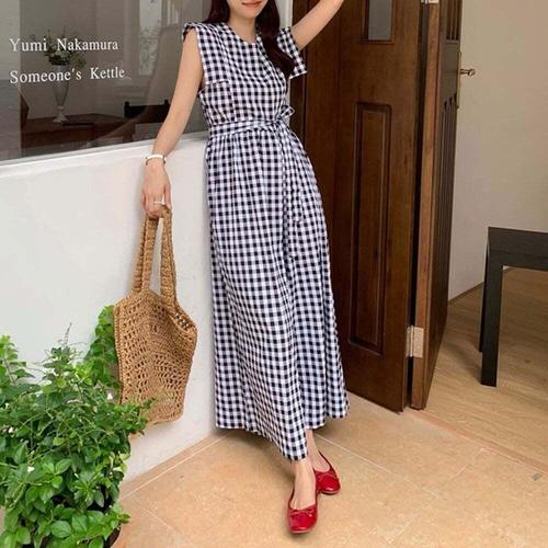 [셀럽하우스]베이직 RRZS1912 체크 라운드넥 암홀커버 와이드 점프슈트