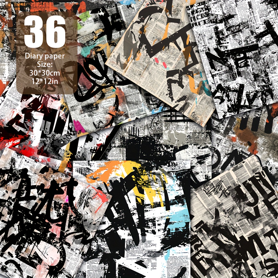 TEMU 어반 스트리트 스타일 신문, 레이어드 텍스트, 거친 손상된 질감 및 하이 그래픽 특징, 스트리트 컬처 콜라주, 모던 아트 배경 및 개인화된 장식에 적합, 12인치 x 12인치, 36매