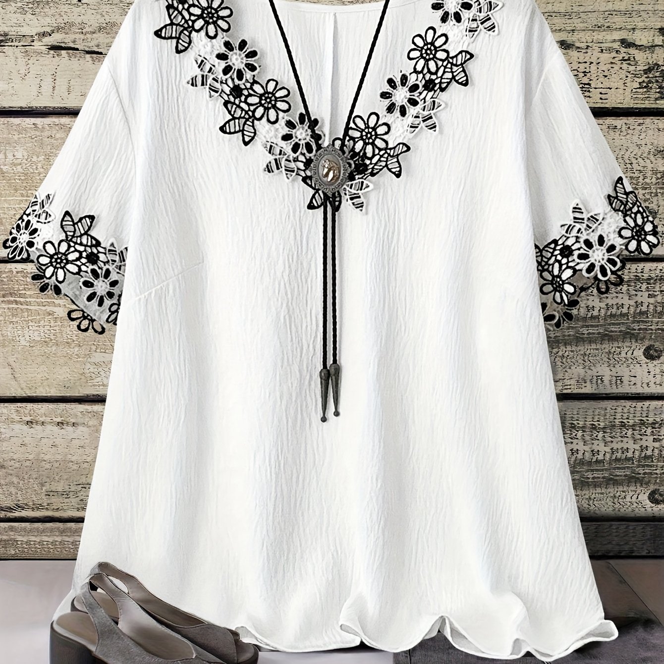 TEMU 플러스 사이즈 - 우아한 플러스 사이즈 여성용 블라우스 - V넥, 반팔, 꽃 자수 및 프린지 디테일, 가벼운 여름 셔츠, 캐주얼 또는 스타일리시한 의상, 다용도 여성용 의류 | 꽃 자수 셔츠 | 프린지 디테일 셔츠, 여성용 블라우스