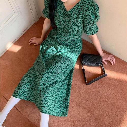 [셀럽하우스]여성스러운 DCVJ1455 레오파드패턴 셔링주름 허리끈 쉬폰원피스