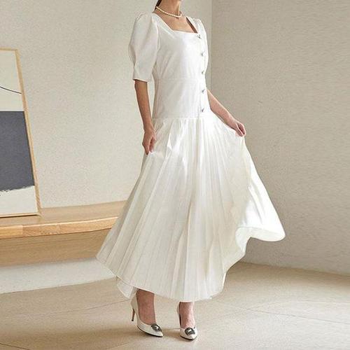 [셀러허브_여성트랜드패션]여자 사각 퍼프 반팔 맥시 주름 롱 원피스 코디 룩