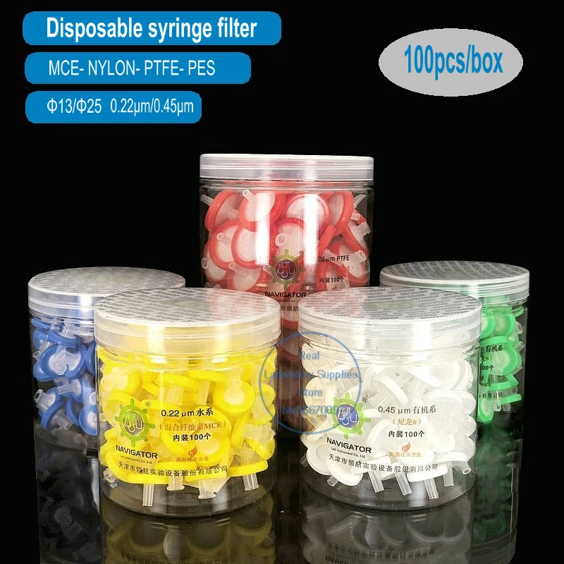 100 개/상자 실험실 13/25mm 일회용 주사기 필터, 0.22um 또는 0.45um PES/MCE/나일론/PTFE/PES 멤브레인