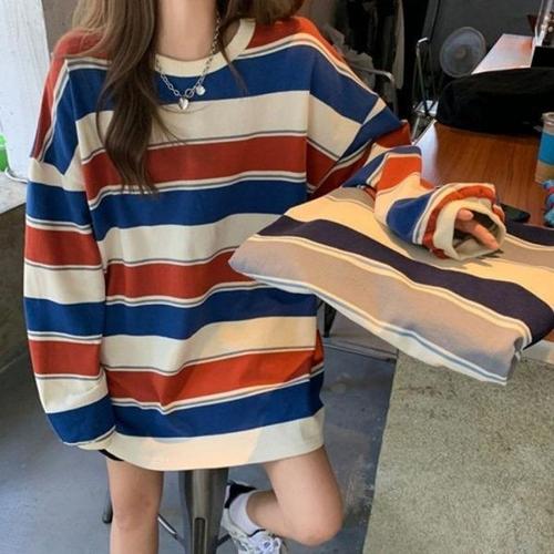 [엄지척]여자 오버핏 스타일 레트로 줄무늬 긴팔티 고품질 꾸_19645757_667501