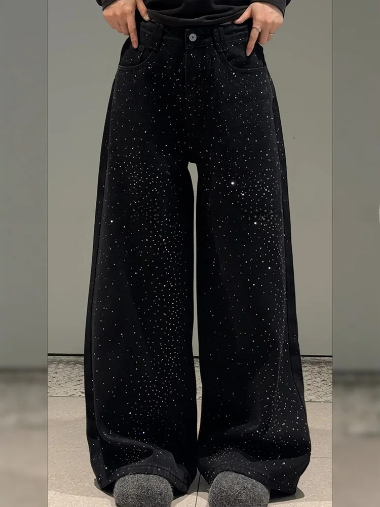 여성을위한 핫 스탬핑 다이아몬드 청바지 2025 봄 가을 유행 반짝 이는 리벳 넓은 다리 바지 여성 스트레이트 느슨한 데님 바지