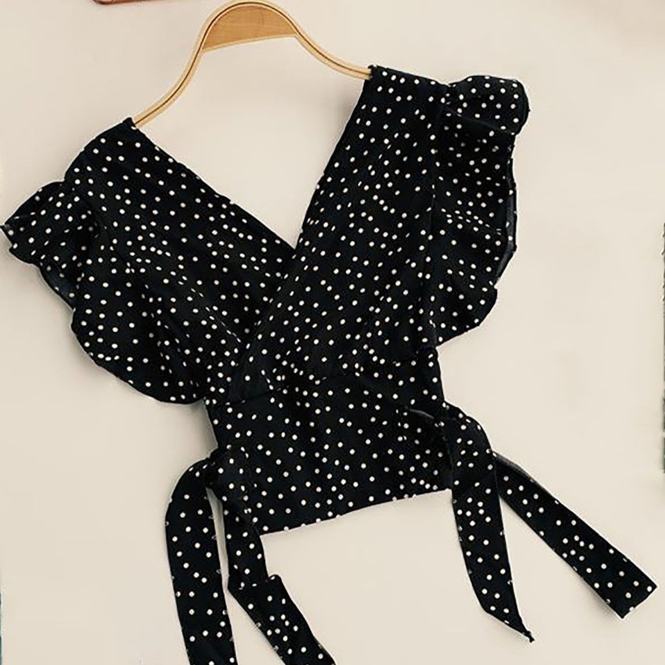 TEMU 여성 여름 브이넥 민소매 블라우스 데일리 캐주얼 패션 도트 소매 프릴 디자인 허리 스트링 리본 디자인 엘레강스 촉감이 부드럽다 시원하고 편하게 입으실 수 있어요 슬림소녀
