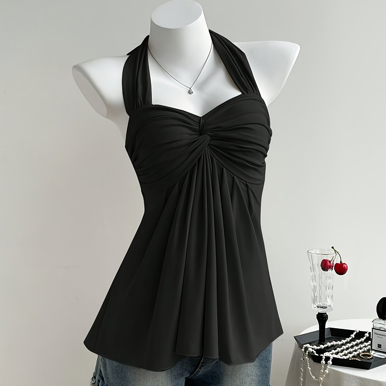 TEMU 여성용 우아한 러플 홀터넥 민소매 탑 - 반투명 층층 튈 디자인, 슬림핏 기계 세탁 가능 가벼운 블라우스 봄 여름 가을용, 캐주얼에서 포멀웨어까지 다재다능한 시즌 패션, 흐르는 질감