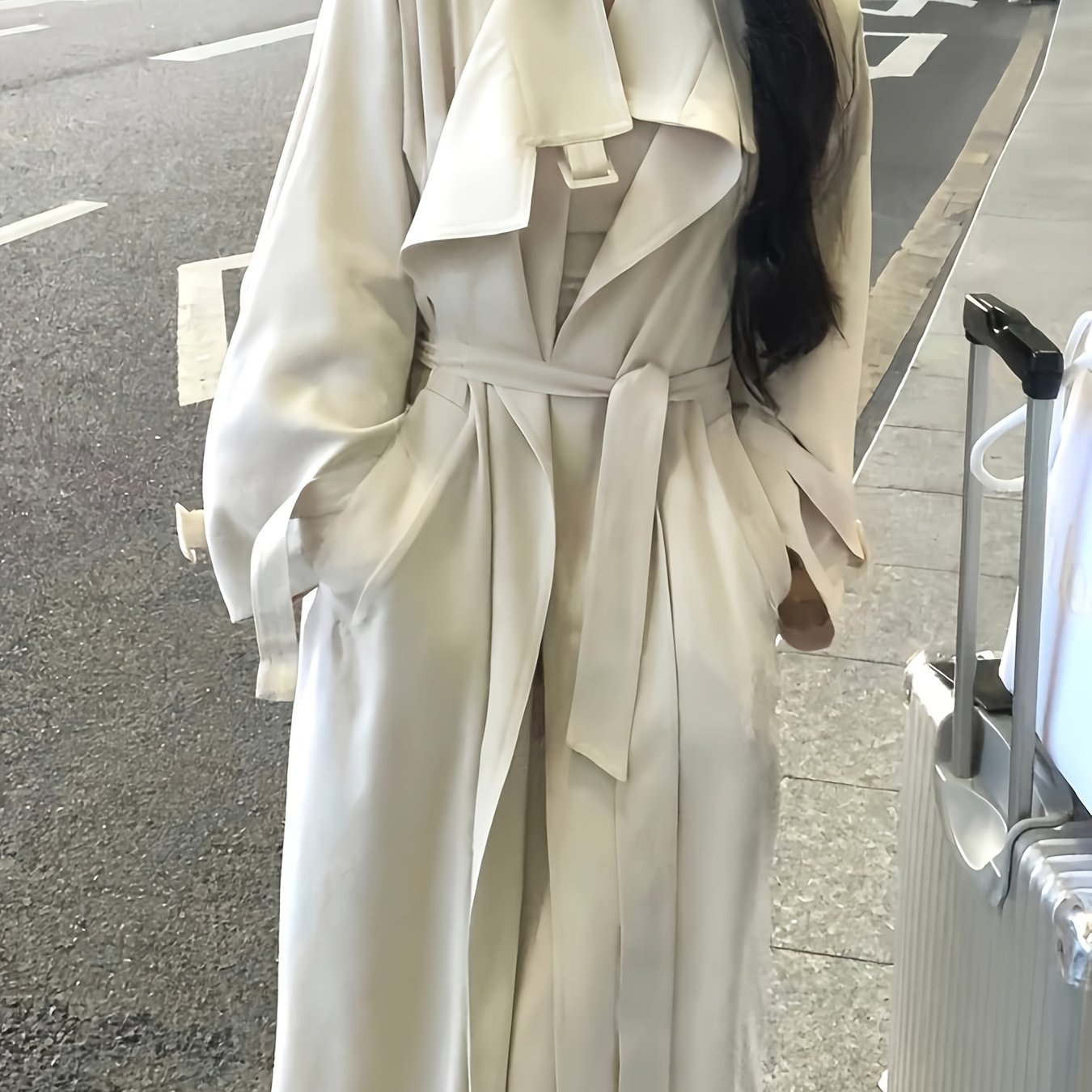 TEMU 여성 데일리 통근 더블 카라 벨트 루즈핏 롱 트렌치코트 블랙 카키 캐주얼 폴리에스테르 봄 가을 야상 데이트 롱 점퍼 겉옷 상의 코디 코트