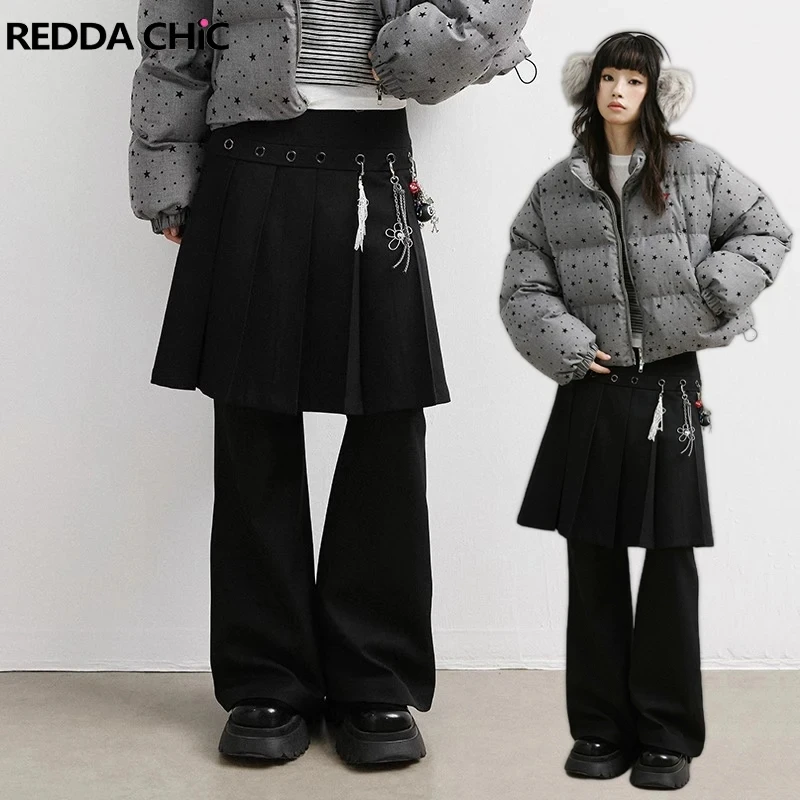 REDDAChiC 스커트 오버레이 여성 드레스 바지 블랙 아일렛 플리츠 로우 허리 부츠컷 와이드 레그 바지 Acubi Fashion Y2k streetwear