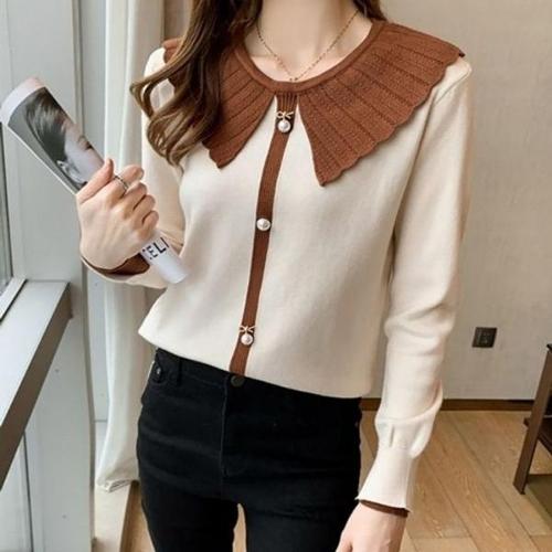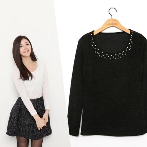 [엄지척]여성 진주 라운드 넥 긴팔 봄 가을 니트 티 브라운_19682045_667501