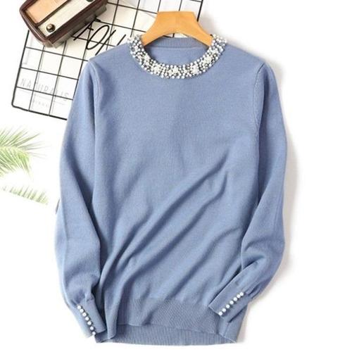 [엄지척]여성 진주 라운드 넥 긴팔 봄 가을 니트 티 블루_19682145_667501