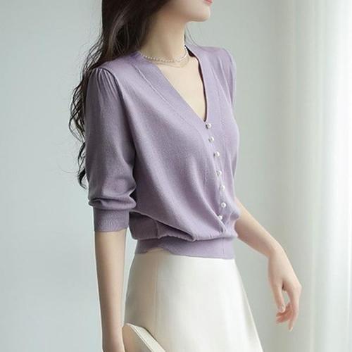 [엄지척]2컬러 진주 단추 장식 브이넥 니트 티 MA8214_19611335_667501