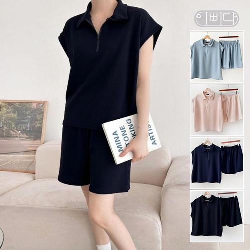 이삐다 국내생산 여성 쿨하고 세련된 지퍼 카라 반팔티 반바지 세트 IBBD25_AS12