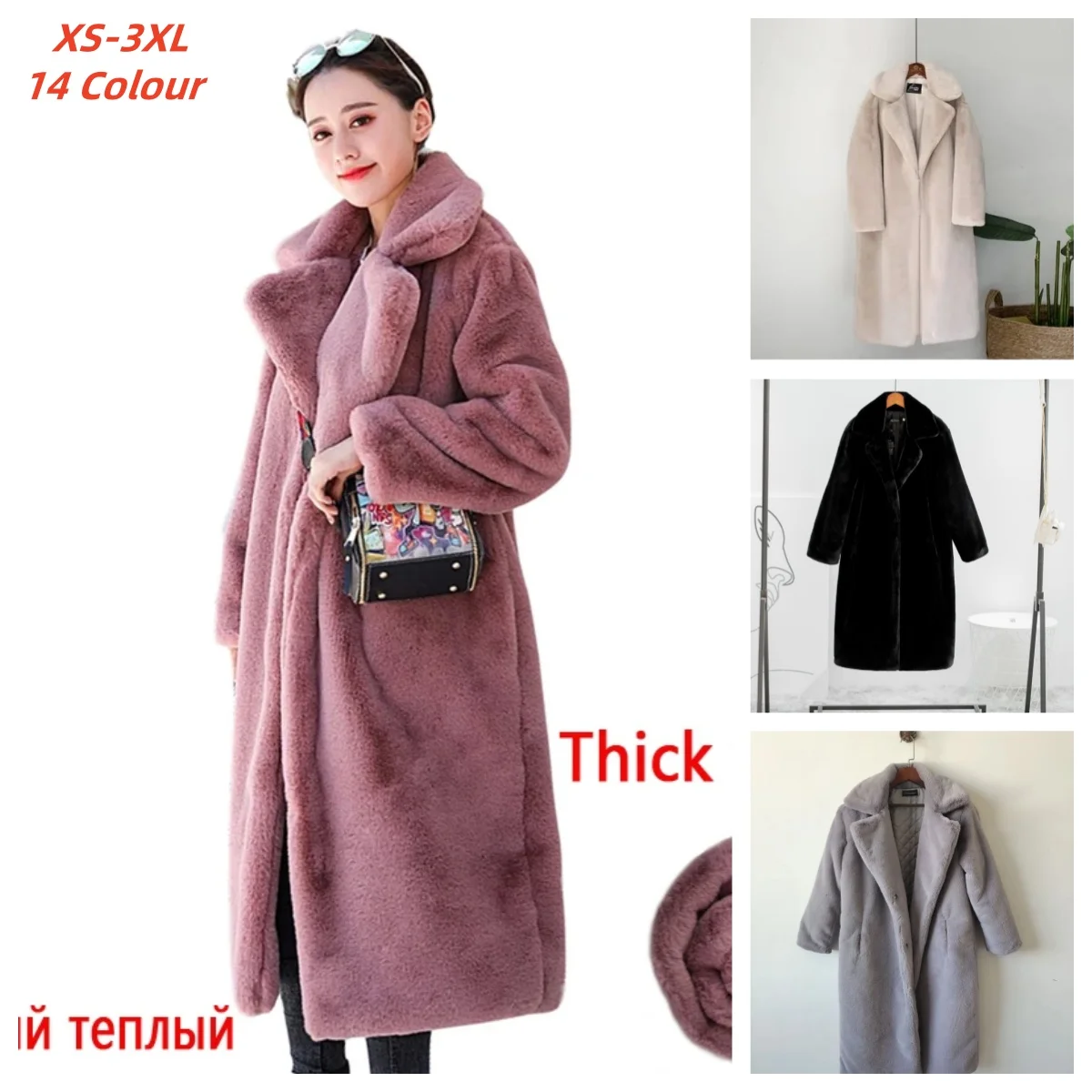 겨울 여성용 고품질 인조 토끼털 코트 럭셔리 롱 퍼 코트 루즈 라펠 오버코트 두꺼운 따뜻한 플러스 사이즈 여성용 플러시 코트