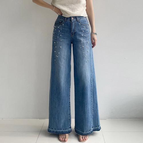 엘쏘 여성용 펄 진주 와이드 데님 팬츠