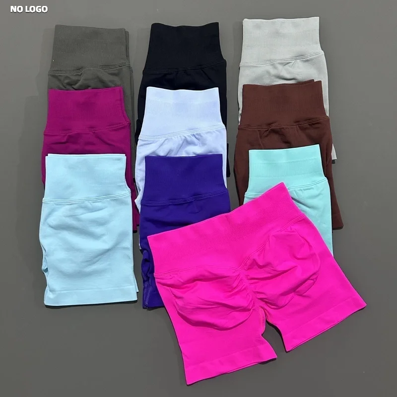 로고 없는 여성 스포츠 반바지 4.5인치 로우 리브드 밴드 짐 스크런치 피트니스 바이커 쇼츠 운동 요가 러닝 심리스 레깅스