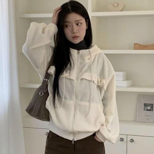 [디자이너몰]여성 루즈핏 프릴 기모 투웨이 후드 집업