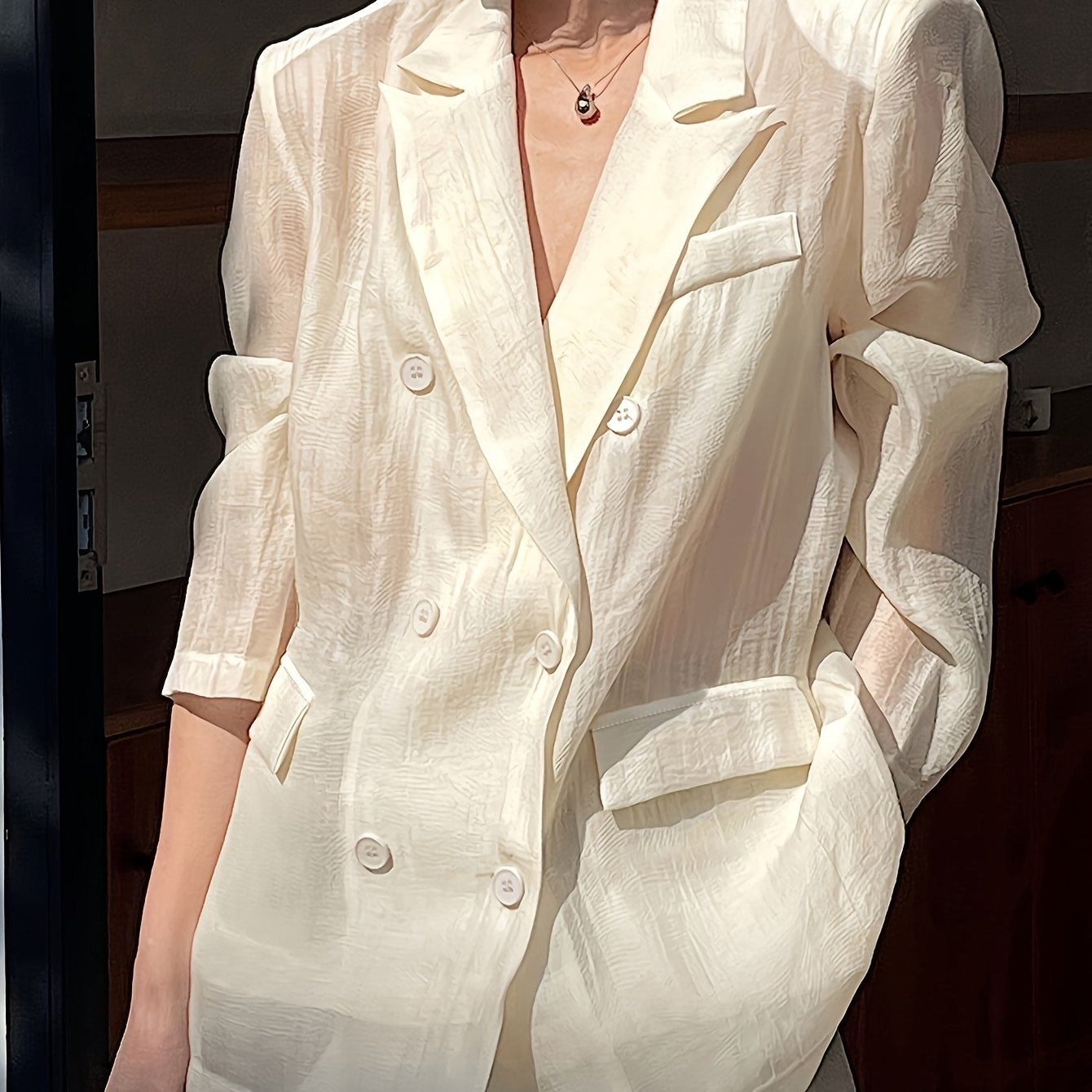 TEMU 여성 캐주얼 더블 브레스트 긴팔 피코트 (포켓 포함) | 단색, 루즈핏, 올 시즌 착용 가능
