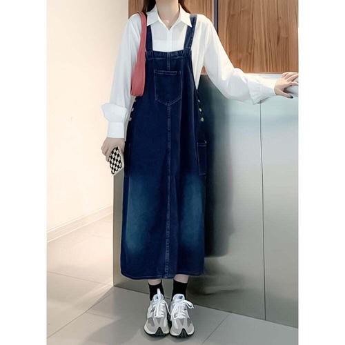 [셀럽하우스]진청원피스 NQPK6563 청청셋업 데님 롱 멜빵치마 마실용 원피스
