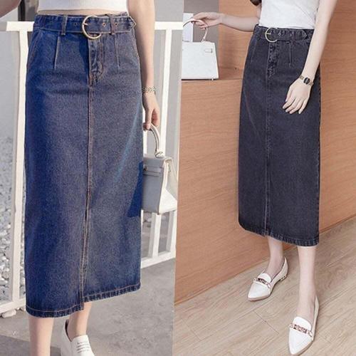 [셀럽하우스]벨티드 NQHR2013 앞트임 롱 데님스커트 청치마