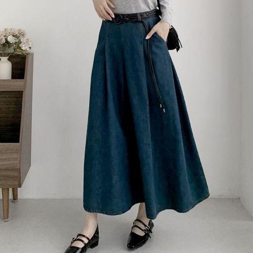 [옷자락] 여자 핀턱 플레어 청치마 뒷밴딩 꽈배기벨트 롱스커트