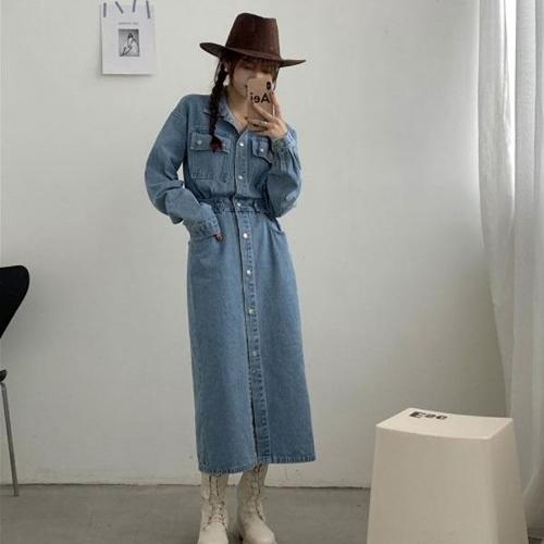 여성용 가을 겨울 빅사이즈 데님 원피스 루즈핏 긴팔 주름 미디 청원피스