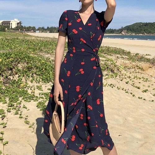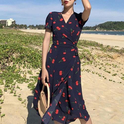[셀럽하우스]원피스 GYHM0956 랩스타일 체리 하객 브이넥 휴양지 롱