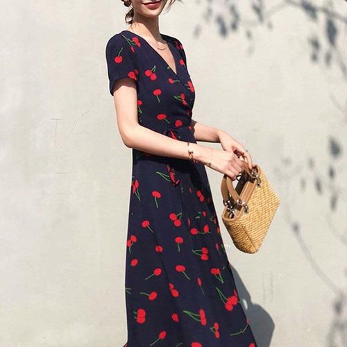 [셀럽하우스]시원한 KIDM8541 인기 여성 여름 브이넥 감성 체리 롱 원피스