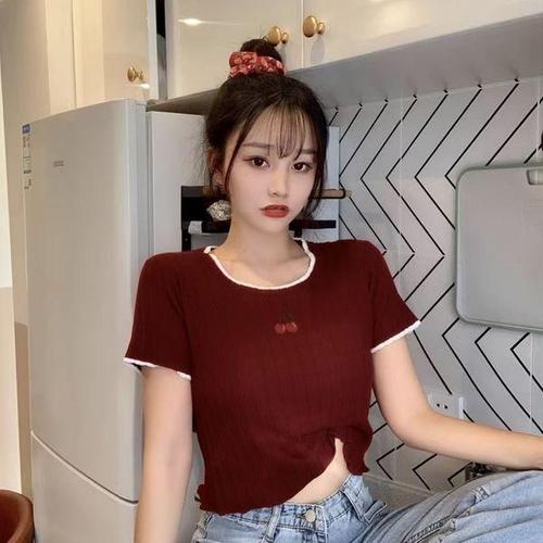 [에이치플러스몰]여자 러블리 체리자수 큐티 여름 반크롭 반팔티셔츠