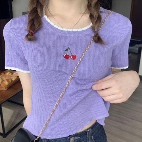 여성 체리 자수 포인트 반크롭 스타일 반팔 티셔츠