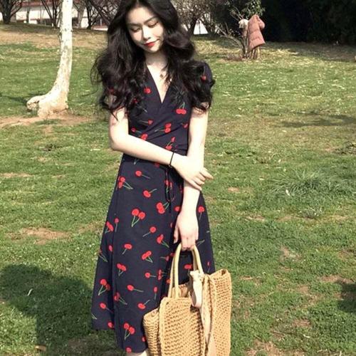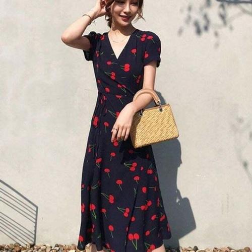 [셀럽하우스]여름 GRUT7716 여성 큐티 체리패턴 예쁜 브이넥 반팔 롱원피스