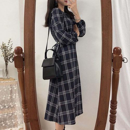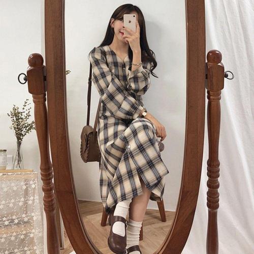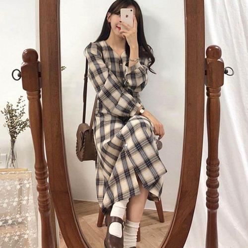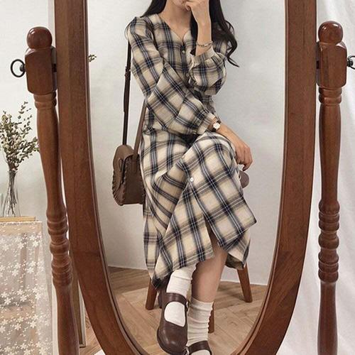 [셀럽하우스]체크 BIRJ8097 패턴 브이넥 셔츠형 단추 롱원피스 가을 데일리
